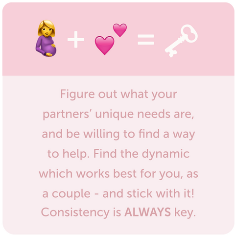 The point here is to listen, figure out what your partners’ unique needs are, and be willing to find a way to help. Find the dynamic which works best for you, as a couple - and stick with it! Consistency is ALWAYS key.