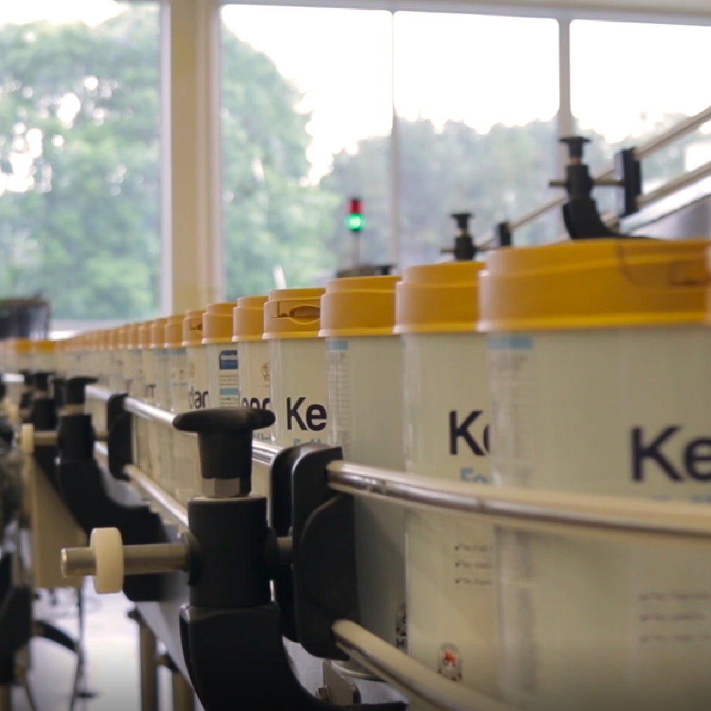 Within hours, our milk has become formula, and it travels to our canning line where it is accurately measured and dispensed into Kendamil cans. Each can is then sealed and ‘crowned’ with our gold overcap.